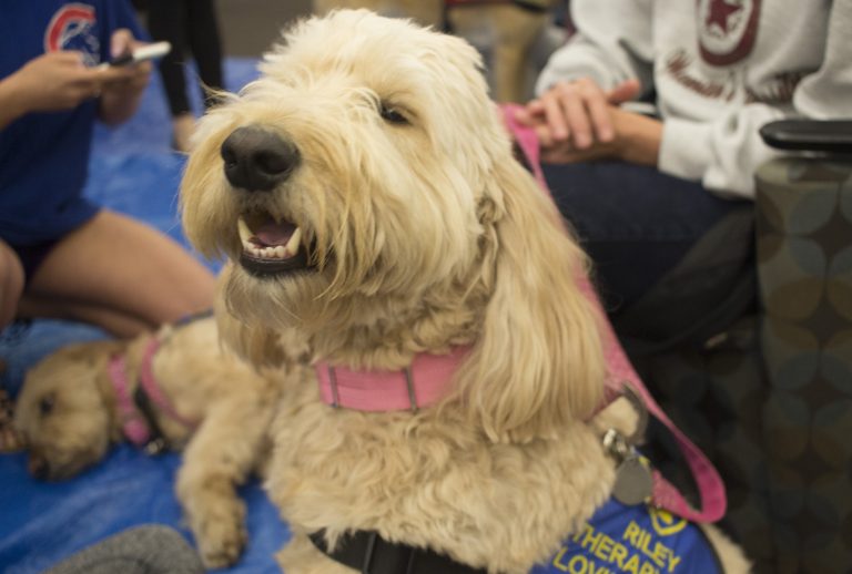For Watkins Health Center’s Stress Busting Study Breaks, volunteers brought their dogs certified by Loving Paws Therapy Dogs to libraries for an hour of petting and relaxing.