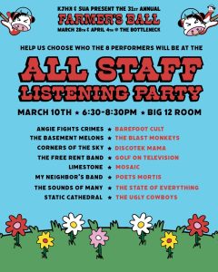 These 16 bands will be showcased at the KJHK All-Staff Listening Party TONIGHT, March 10th from 6:30-8:30pm in the Big 12 Room on the 5th floor of the Kansas Union. This event is open to all KJHK and/or SUA volunteers and staff.