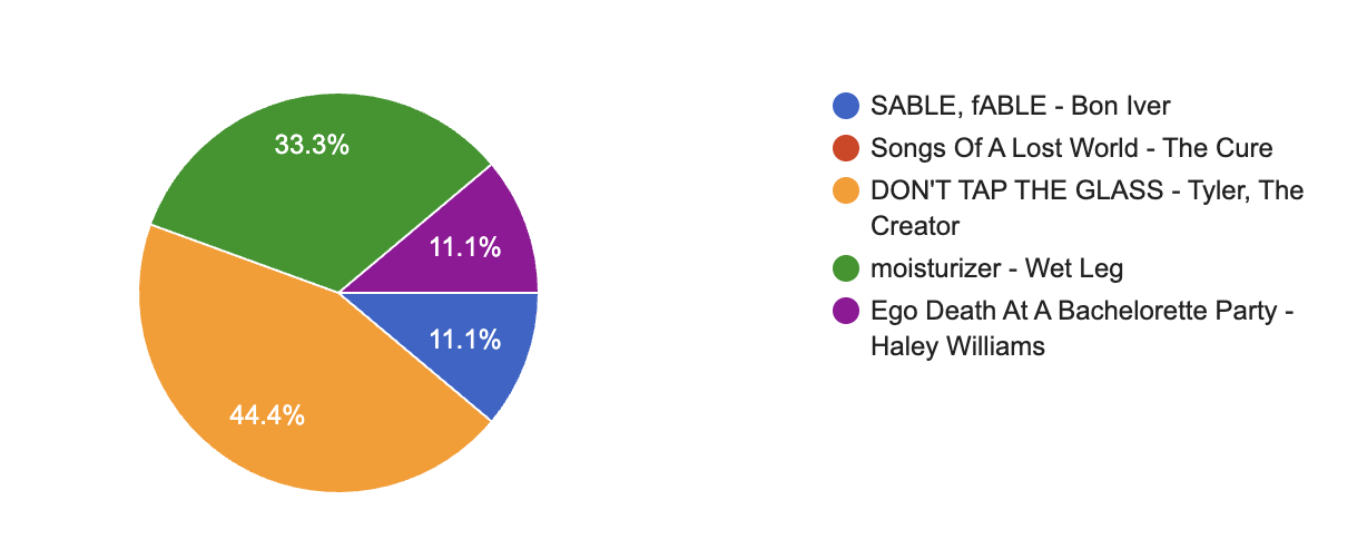 Tyler, The Creator has been–and likely always will be–an absolute favorite at KJHK. Not even a year after the release of CHROMAKOPIA, Tyler’s release of DON’T TAP THE GLASS was an incredible follow up featuring a turn towards a more upbeat sound and catchy instrumentals. Despite our love for Tyler, the nominees for Best Alternative Album are all incredibly solid albums, specifically artists like Bon Iver, The Cure, and Hayley Williams.
