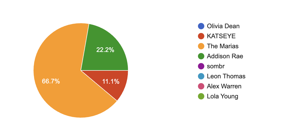 The Marías are a clear Exec Staff favorite here at the station. Despite releasing music since 2017, The Marias have proven their place in the industry through the increase of popularity with their music, such as their song, “No One Noticed,” and their most recent album, Submarine. With music as hypnotically ethereal as The Marías’, it is no surprise that they are our clear pick for Best New Artist.
