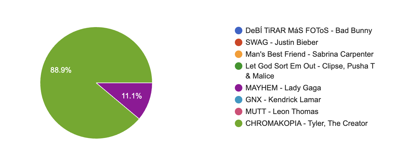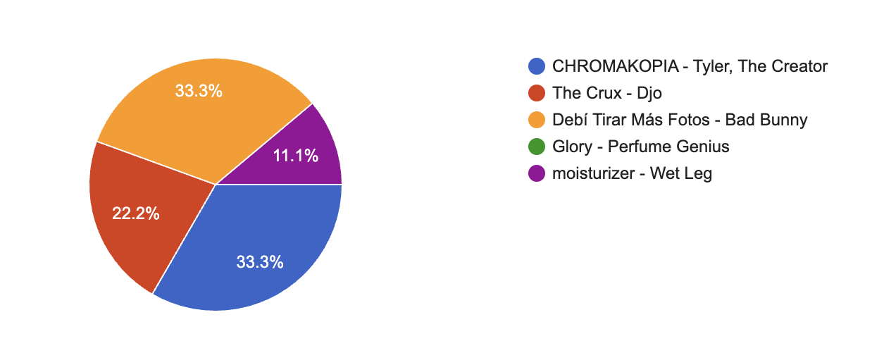 While we have a tie for this year’s Best Album Cover, both covers are exemplary of the thought that should go into album artwork. The cover for CHROMAKOPIA encapsulates the album perfectly, both in aesthetics and themes, while the deceptively simplistic DeBÍ TiRAR MáS FOToS cover symbolizes the albums themes of heritage nostalgia, and loss.