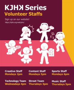 KJHK is open year-round for new members, and we would love for you to join us this spring! Our volunteer staffs are open to all students, and are led each week by some of our wonderful Executive Staff members. Keep reading for our weekly schedule and to learn more about each of our staffs.