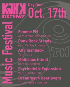 KJHK is approaching its 50th year on-air! To celebrate, we’re hosting a four-day event from October 15-18. This event will highlight the long history of involvement KJHK has had within the Lawrence community, showcasing the local art, music, people, and organizations that make Lawrence the vibrant city it is today.